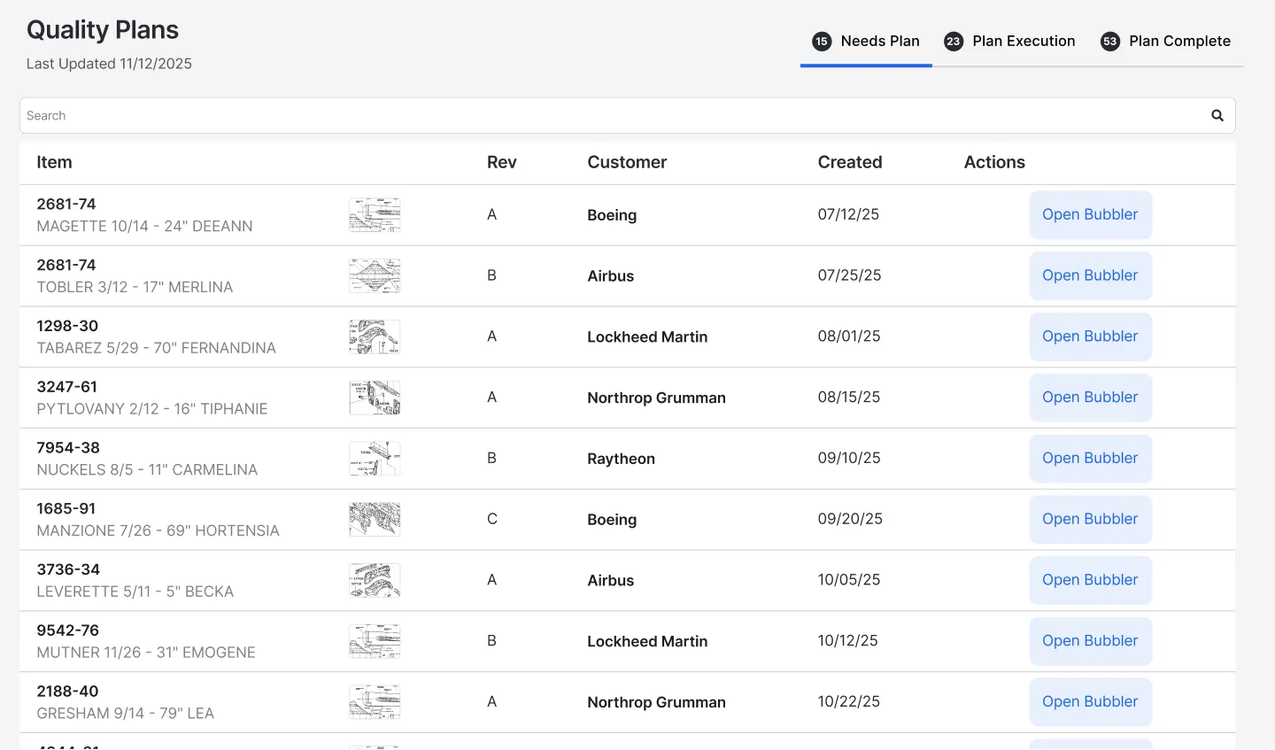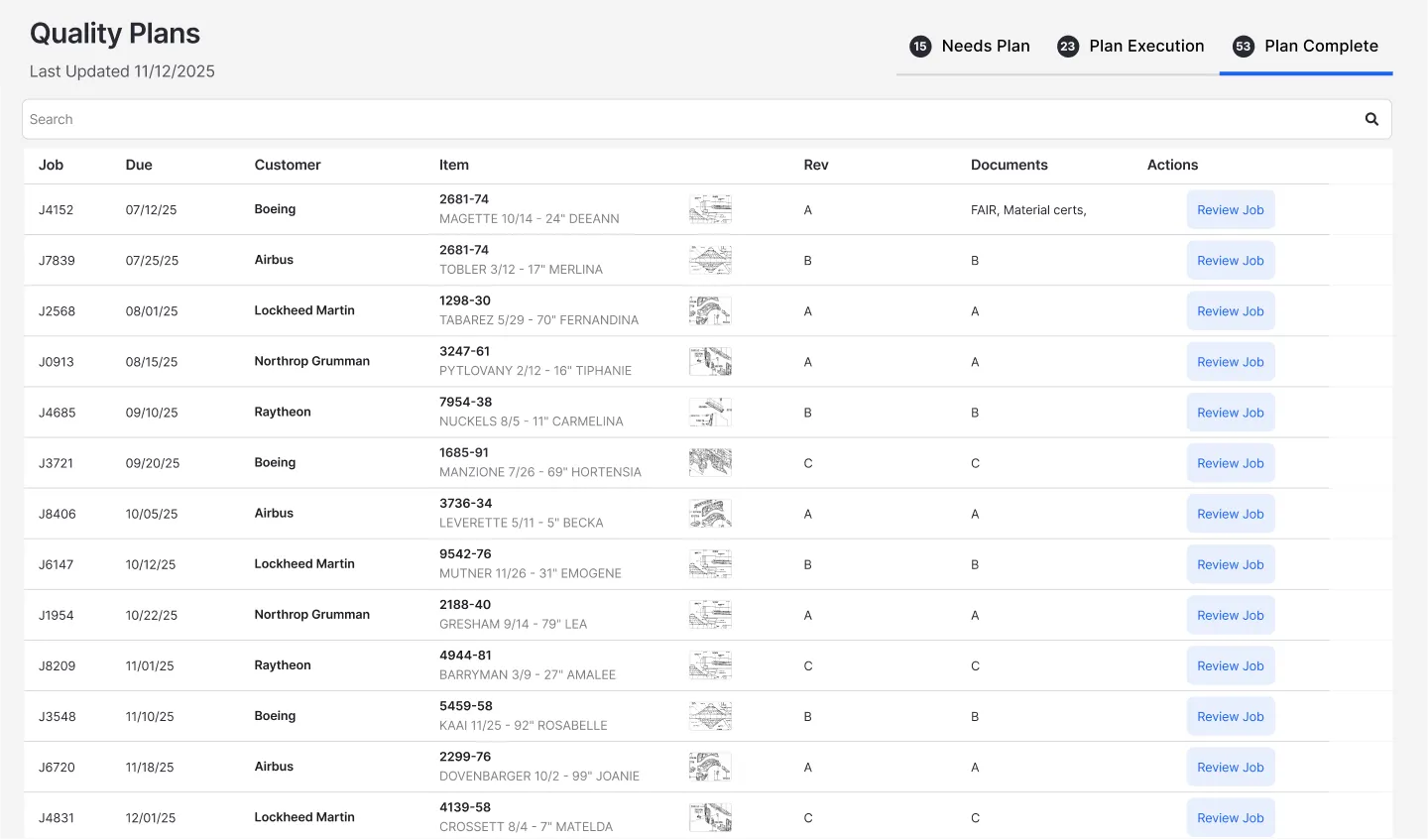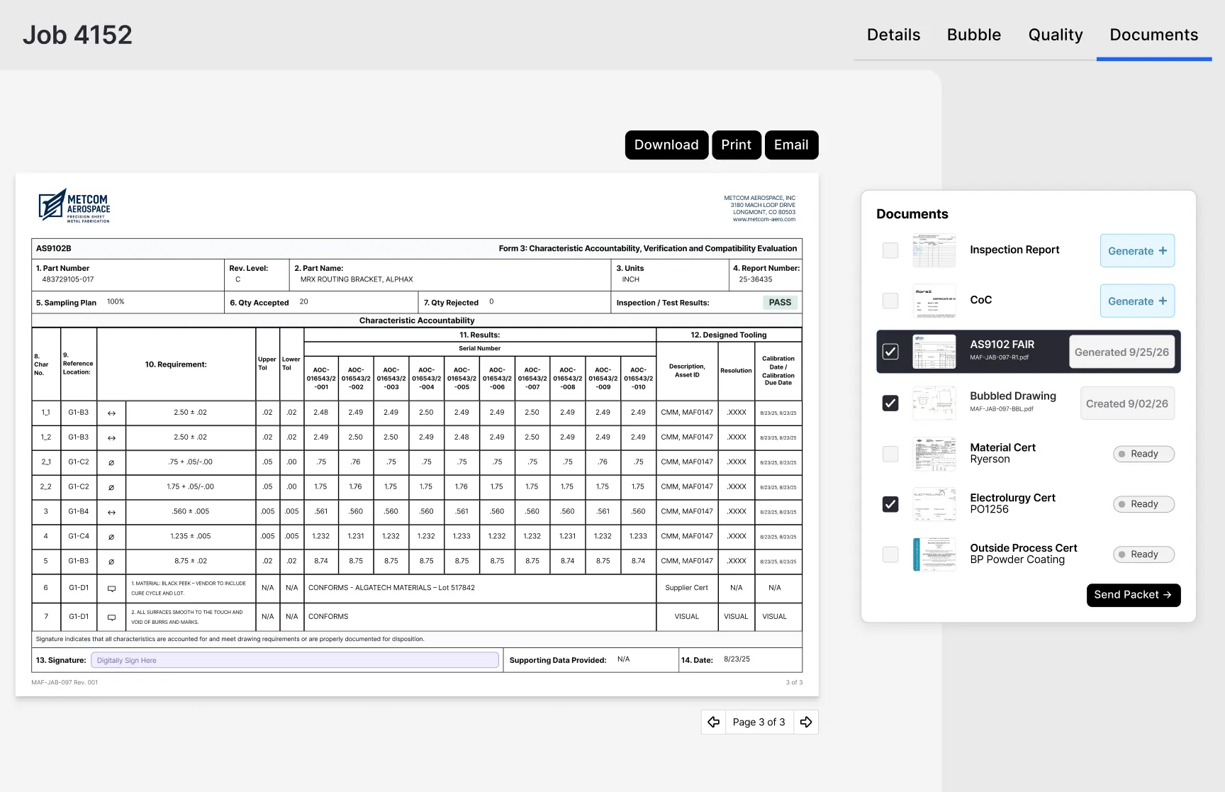 With Fulcrum, you can upload photos, CMM data, and material certs straight from the floor — all version-controlled, searchable, and automatically linked to the right part. Your document packets assemble themselves, formatted for AS9102, PPAP, or customer-specific templates.