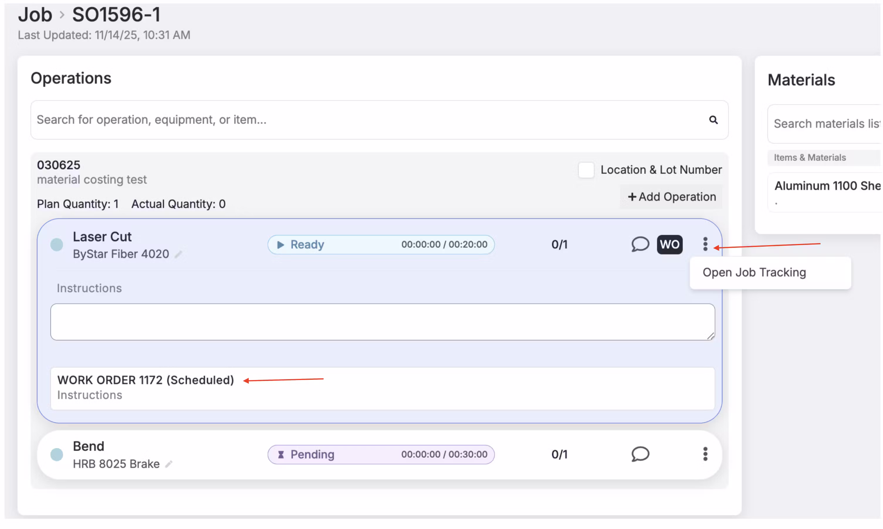 By popular demand, you can now navigate directly to the WO in job tracking from the operations card on the job page. This was previously only available for non-work-ordered operations. We also added visibility to the work order status in operation instructions.